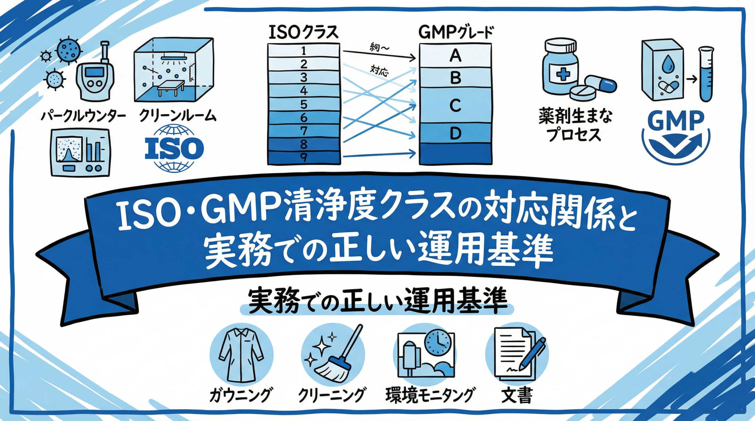 - ISOクラスは主に「微粒子数」で分類する工業規格ですが、GMPグレードは微粒子に加え「微生物汚染リスク」や「作業状態(作業時/非作業時)」を考慮した医薬品製造のための管理基準です。